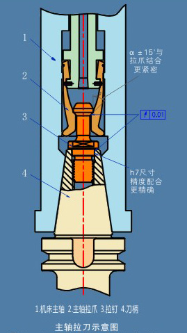 拉釘標(biāo)準(zhǔn)及其組合:拉釘是能過螺紋固定在各種工具柄的尾端的零件。機(jī)床主軸內(nèi)的拉緊機(jī)構(gòu)借助它把刀柄拉緊在主軸中、拉緊力的保持靠一組彈簧,拉緊后就足以防止刀柄及刀具從高速旋轉(zhuǎn)的主軸中脫出。