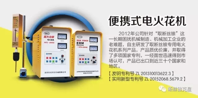 “取斷絲錐電火花機(jī)”,體積小、重量輕,可方便去除折斷在任意大小工件中的斷絲錐、斷鉆頭等,尤其適用于難以在電火花機(jī)床上加工的大型工件。